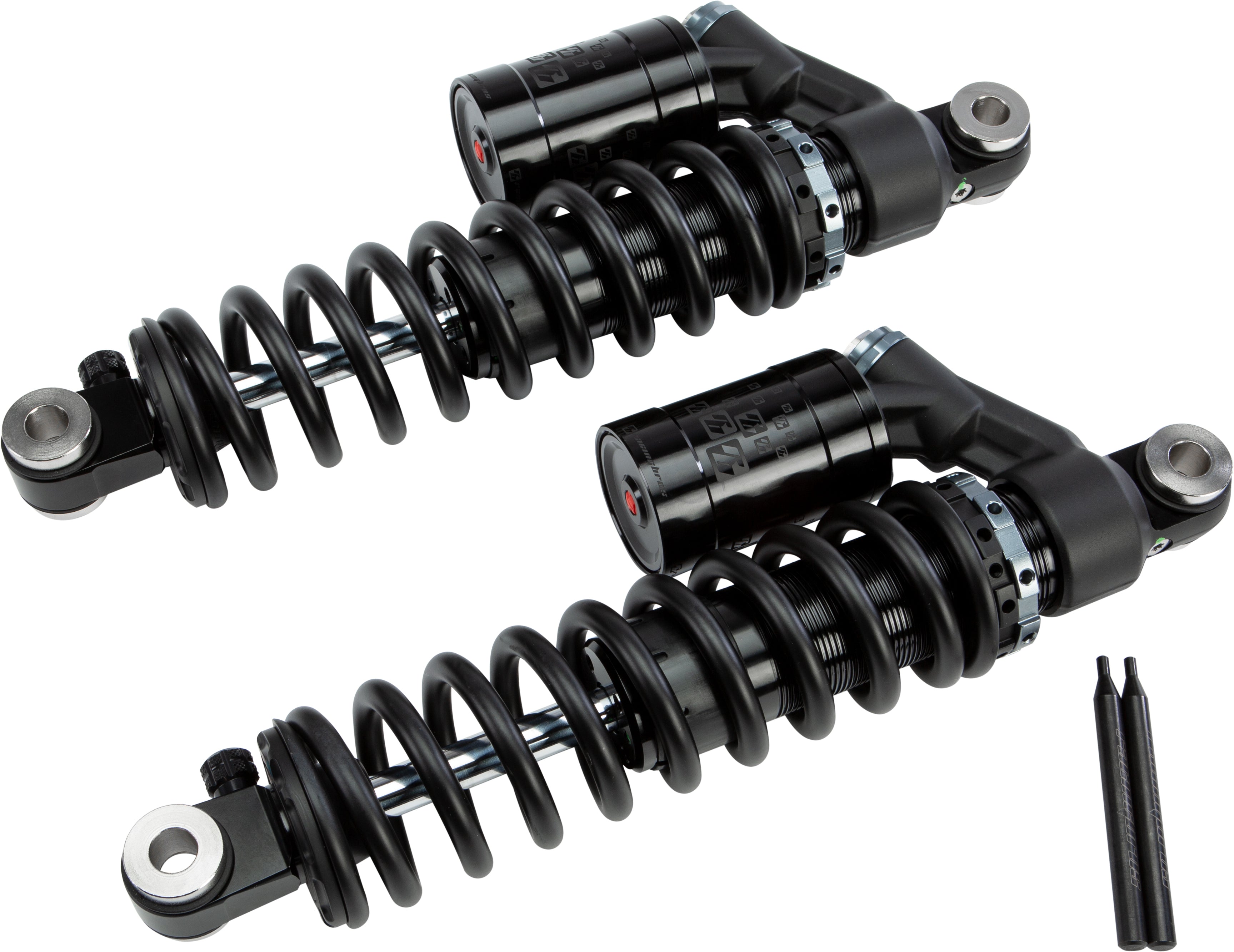 HardDrive remote reservoir rear shocks by RacingBros feature full adjustability with preload, compression and rebound adjusters to easily adapt to all riding styles and conditions. Whether you choose stock 12.5 length for your Dyna or Sportster, or you want the tall 14 curb hopper club style look, these performance shocks with race proven Speed Adaptive Valving will provide you with the ultimate ride.
