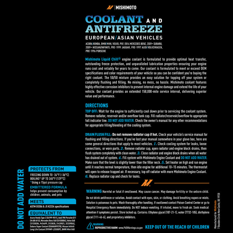 Mishimoto's Liquid Chill Original Equipment engine coolant is formulated with an ethylene glycol base to provide optimal