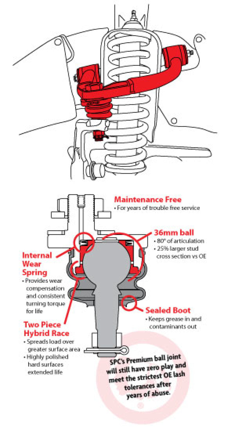 Improve droop travel, drivability and tire wear as well as adjusting tire position in your wheel well with SPC's adjustable front upper control arms on many Toyota trucks and SUVs. Featuring our long life maintainable ball joint and SpecRide bushings, this arm is designed to correct alignment angles while maintaining factory ride quality. SPC's integrated tubular and cast steel design provides the strength and durability needed for the most demanding environments. These remove and replace arms are available in pairs for lifted and off-road applications. Get more droop travel: SPC's arm has improved clearance to get around the spring bucket when the arm droops, eliminating arm to frame contact on lifted trucks. The maintainable ball joint has an oversized ball and allows more than 80deg of articulation to ensure it never binds. SpecRide bushings have free pivot to eliminate any chance of bushing failure seen on many high travel suspensions. Get your drivability and tracking back: When you lift your truck you affect caster and camber. SPC's arms have +1deg of caster built into them. Using its patented ball joint design the arm will get you 0deg to +4deg of caster and +-2deg of camber. Get your tire where you want it in the wheel well: Use adjustment in the control arm and on the OE lower cams to maximize alignment angles and move oversized tires forward in the wheel well to minimize or avoid fender trimming. Do you need replacement cams for the lower control arm? Check out SPCp/n 25445, which will replace corroded cam bolt assemblies. * On the adjustable ball joint SPC uses hex chromate free finish and offers a 700hr salt spray finish for the best corrosion protection available. California Residents WARNING